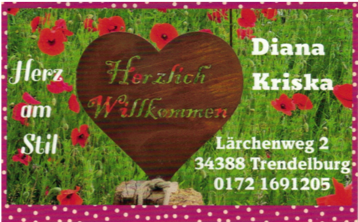 Aber Frau Kriska hat in Deisel ein Lädchen, wo sie noch mehr Deko ausstellt und zu verkaufen hat. Vielleicht finden Sie ja hier ein schönes Stück, dass Sie dann auch später an die schöne Zeit in Trendelburg erinnert.